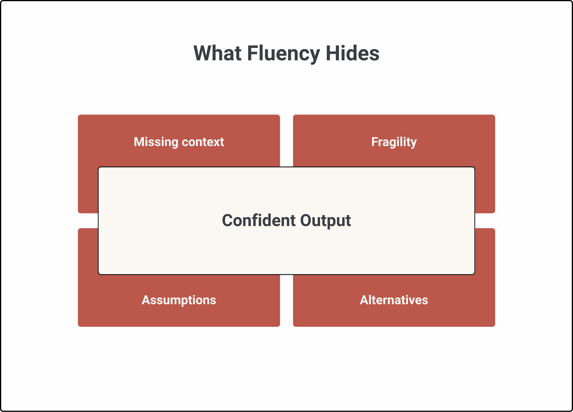 The output presents one path forward, even when several were plausible. A strategy recommendation may make one option look inevitable simply because the other viable paths were never shown. This is why fluency is so powerful. It does not merely hide uncertainty. It replaces the need to look for it.