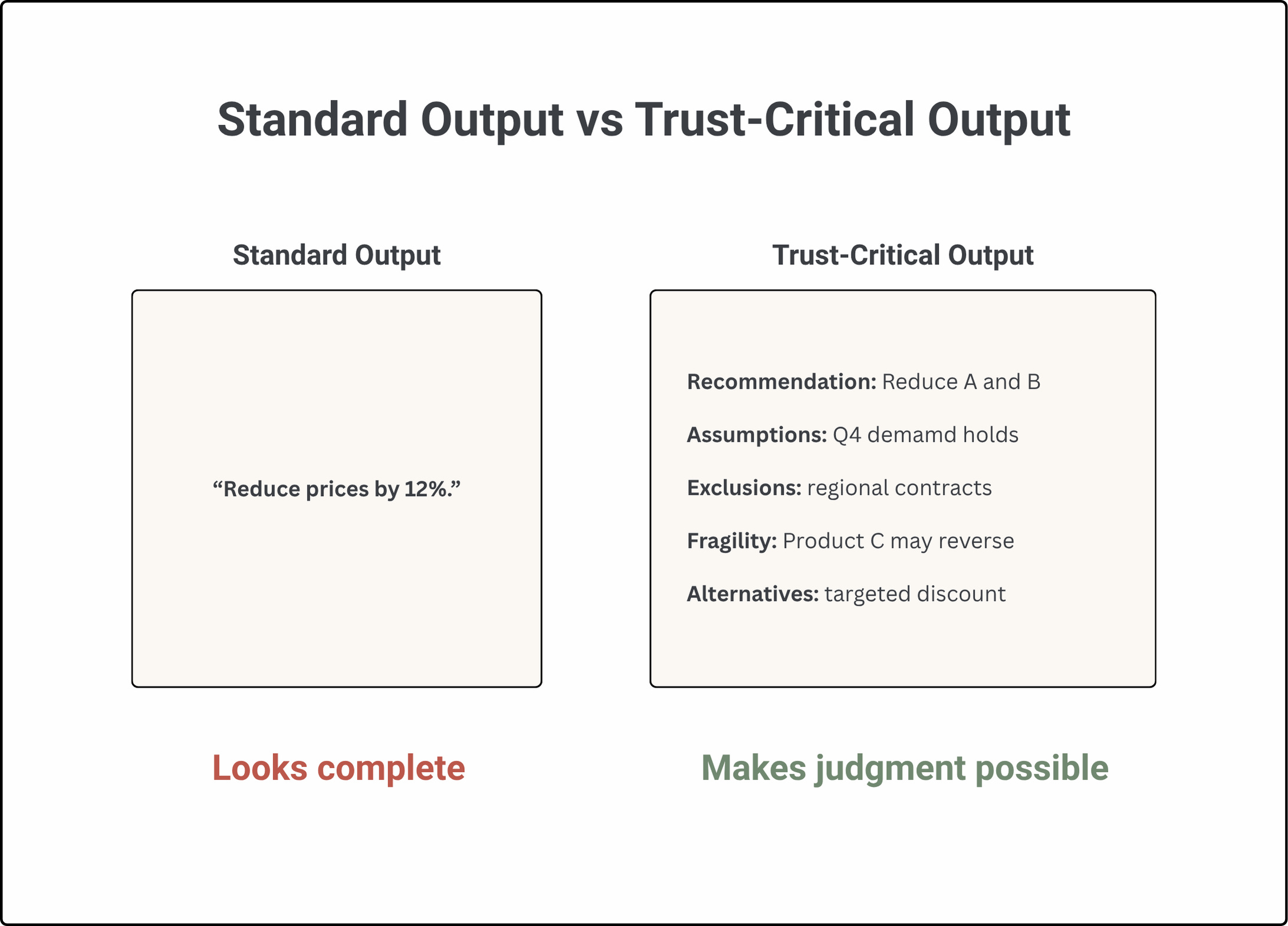 In trust-critical AI, the goal is not to make every output longer. The goal is to make the right uncertainty visible at the right moment. Not everything needs the same level of scrutiny. Low-stakes, reversible actions do not need heavy decision infrastructure. But when the output affects revenue, operations, customers, people, safety, compliance, or strategy, fluency is not enough. The system has to show its work in a way that supports judgment.